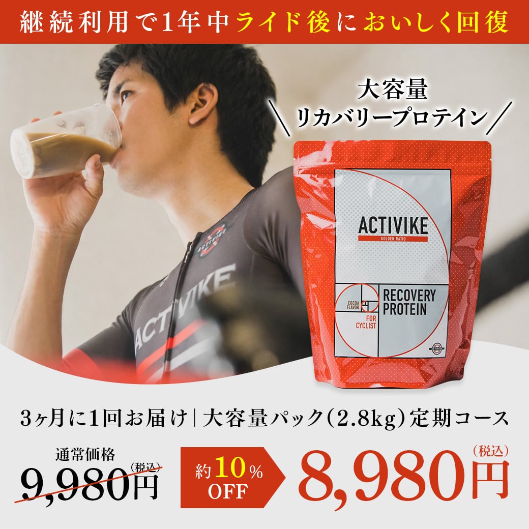 ライド後の回復に特化した、糖質とタンパク質を2:1の「黄金比」で配合したリカバリープロテインです。