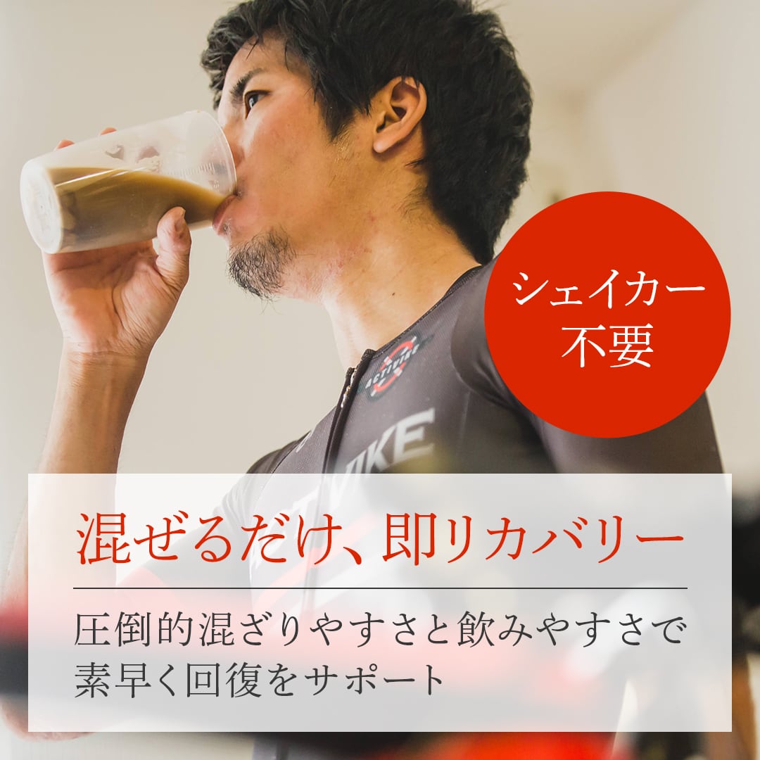 ライド後の回復に特化した、糖質とタンパク質を2:1の「黄金比」で配合したリカバリープロテインです。