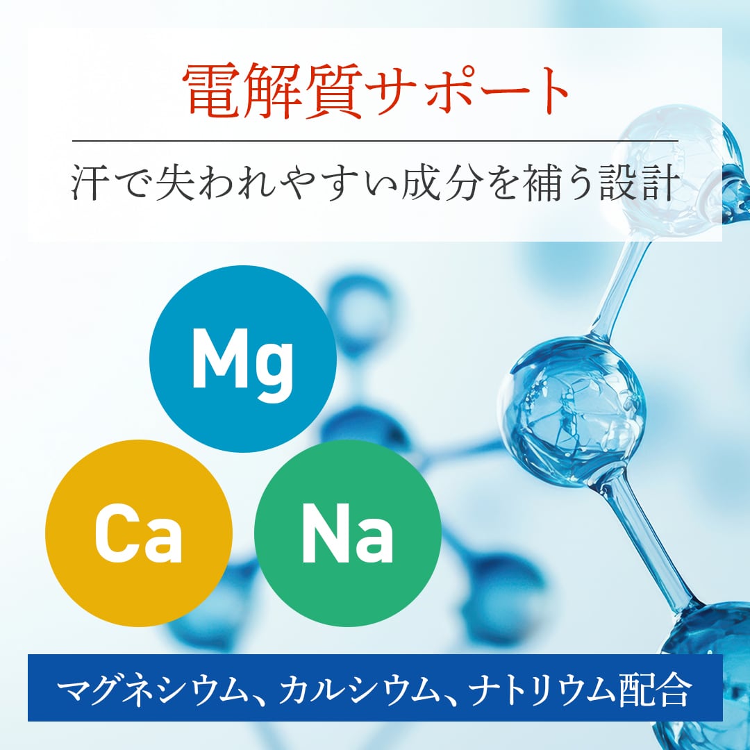 ナトリウムやマグネシウム、カルシウ厶を配合し脚つりになる可能性を軽減する。